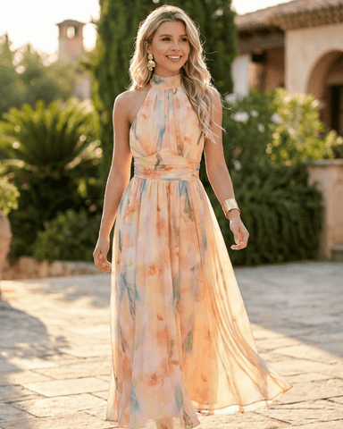 • Material: Lightweight chiffon blend • Design: Fitted halter top with gathered waist and flowing skirt • Details: Subtle watercolor print, high neckline • Style: Feminine, Romantic • Fit: Fitted top, loose skirt • Length: Midi • Sleeves: Sleeveless halter • Season: Spring, Summer • Available Sizes: S–2XL