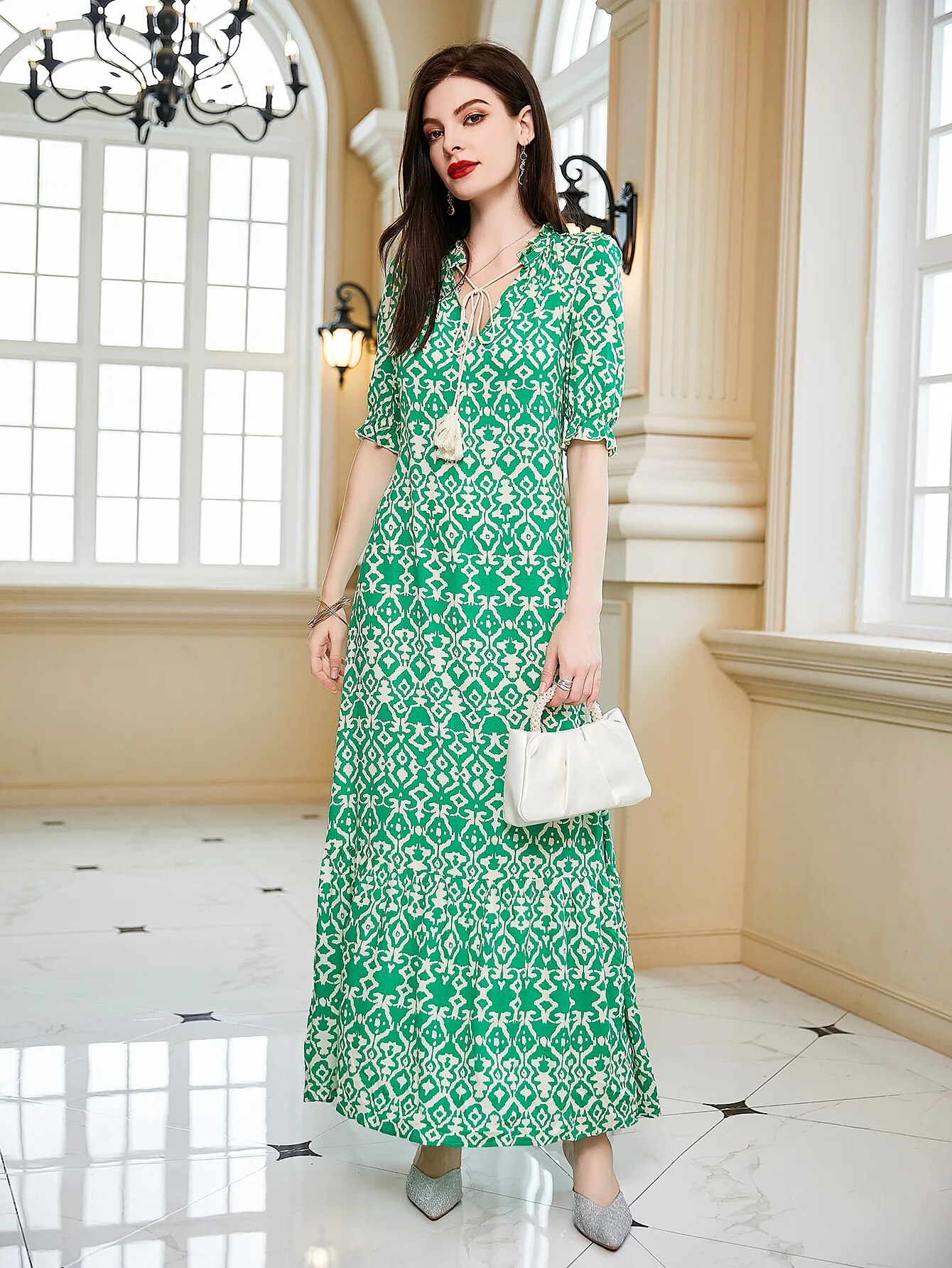 This Fashion Women's Sexy V Neck Elegant Prom Print Casual Maxi Dress is a stunning choice for any occasion. The dress features a stylish and alluring V-neck design that accentuates your neckline and adds a touch of elegance to your look.With its eye-catching print, this dress is perfect for both casual and formal events. The vibrant and intricate pattern adds a playful and fashionable element to the overall design. Whether you're attending a prom or a casual gathering, this dress will make you stand out in the crowd.