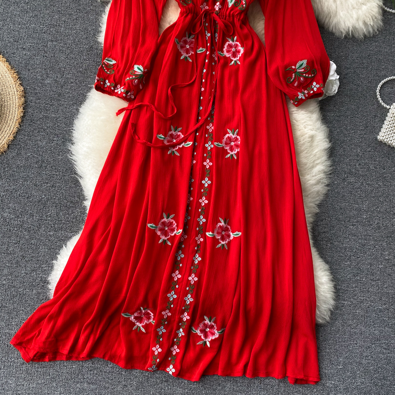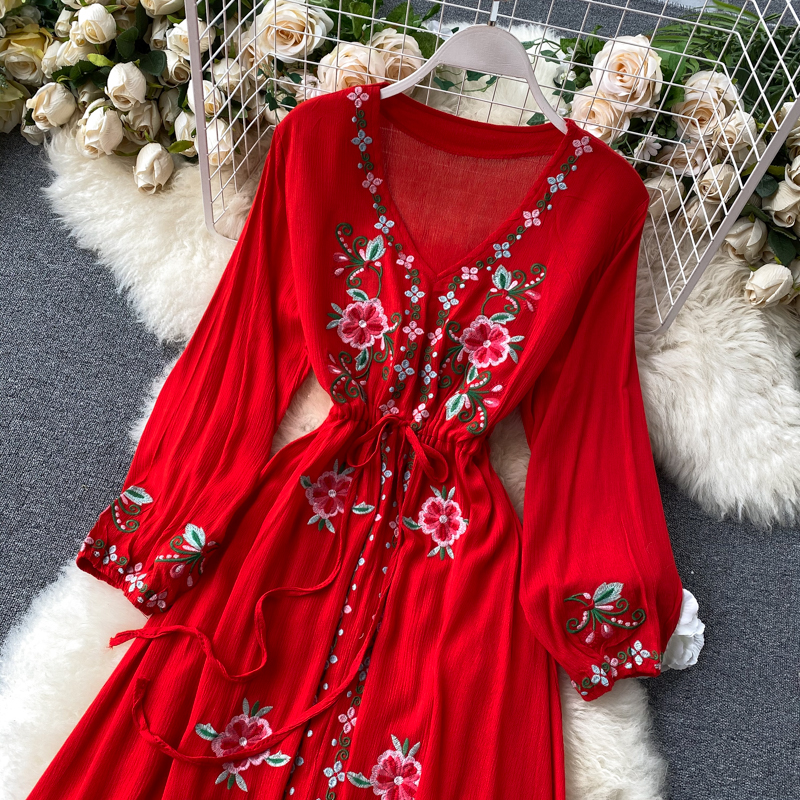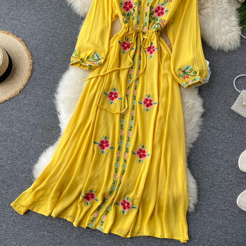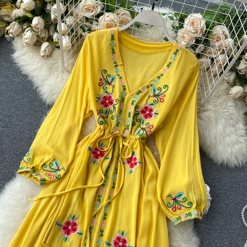 2024 Spring Summer Women's New Solid Color V-Neck Long Bubble Sleeves Large Swing Slim Dress
